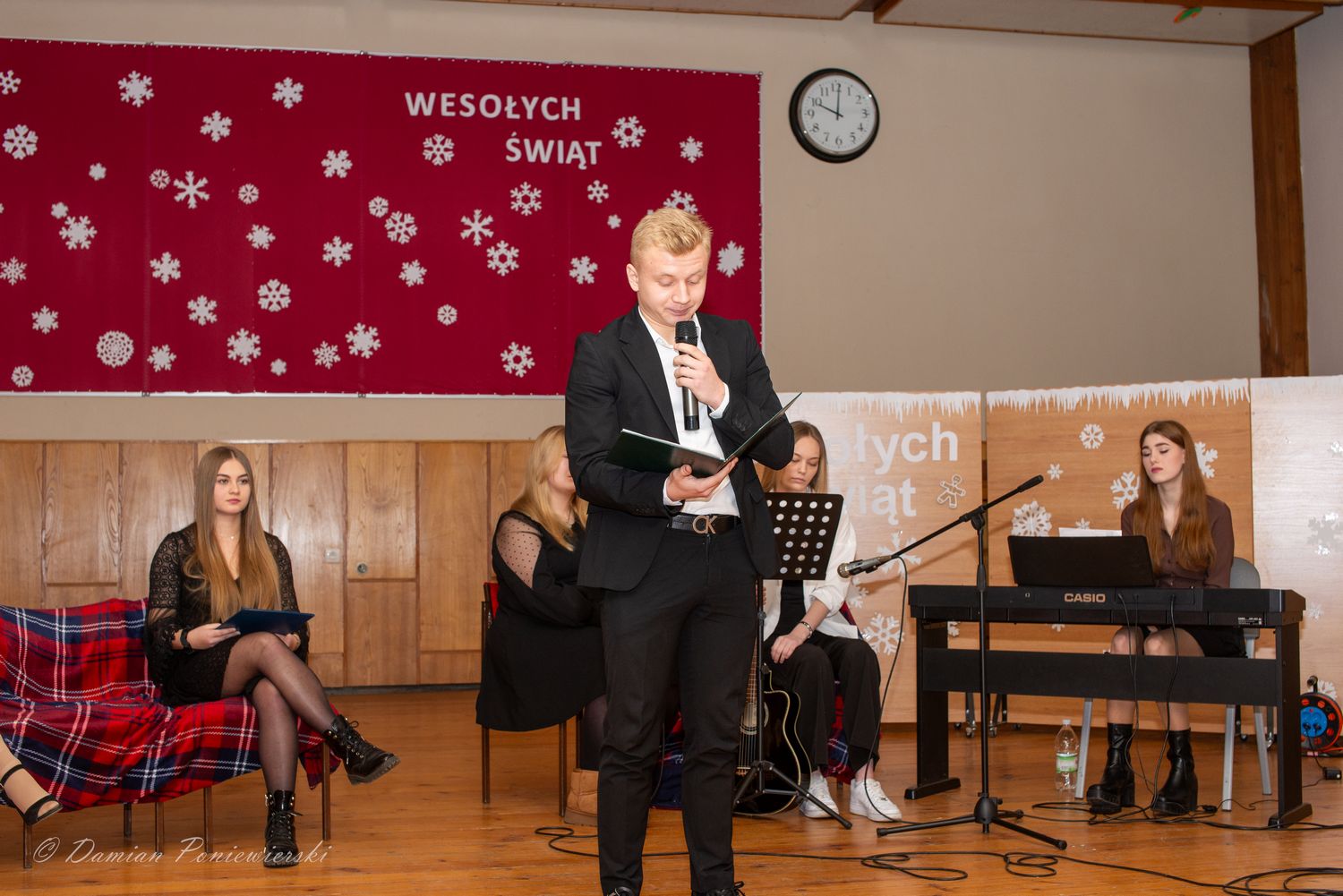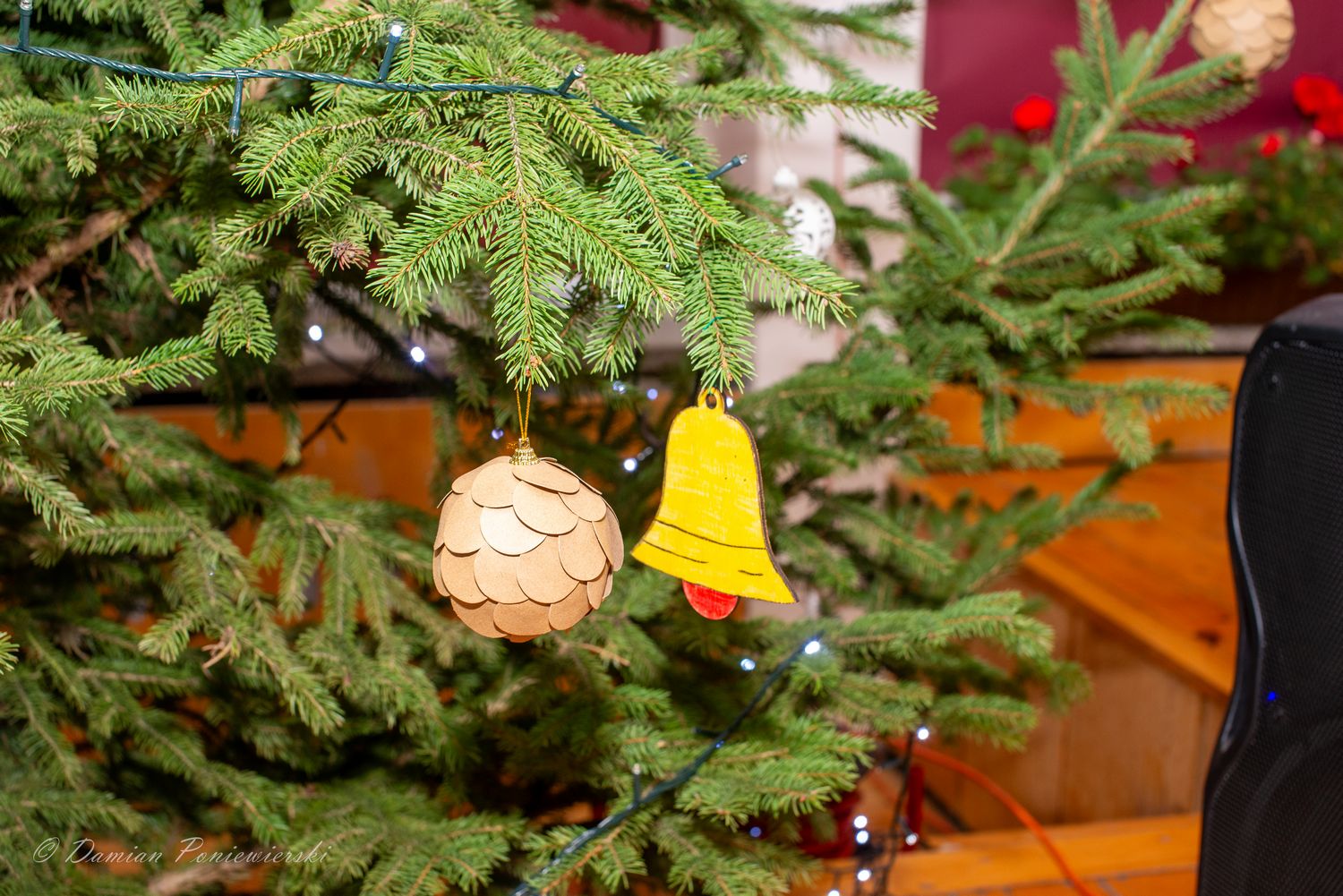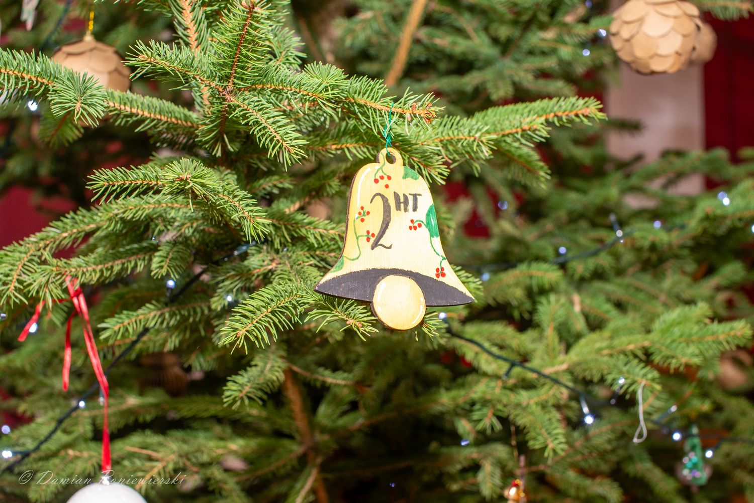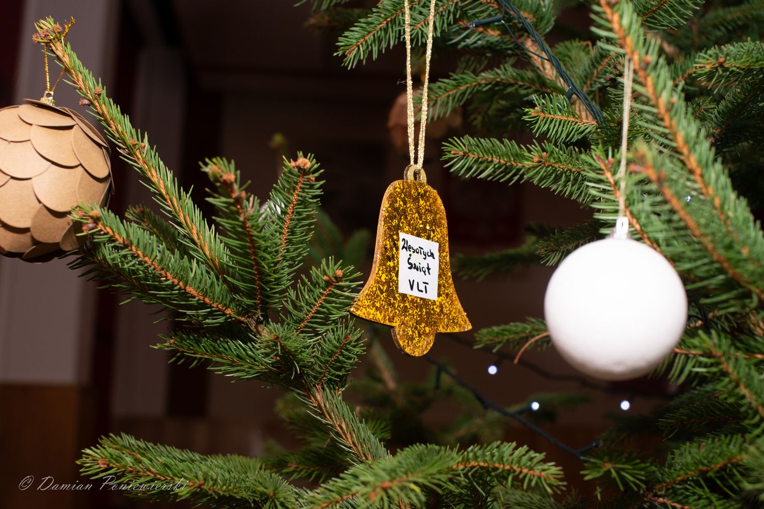 Aleksander Leks, przewodniczący Samorządu Uczniowskiego, złożył życzenia świąteczne całej społeczności szkolnej i zaprosił przedstawicieli klas do zawieszenia bombek na choince, co podkreśliło świąteczny nastrój.