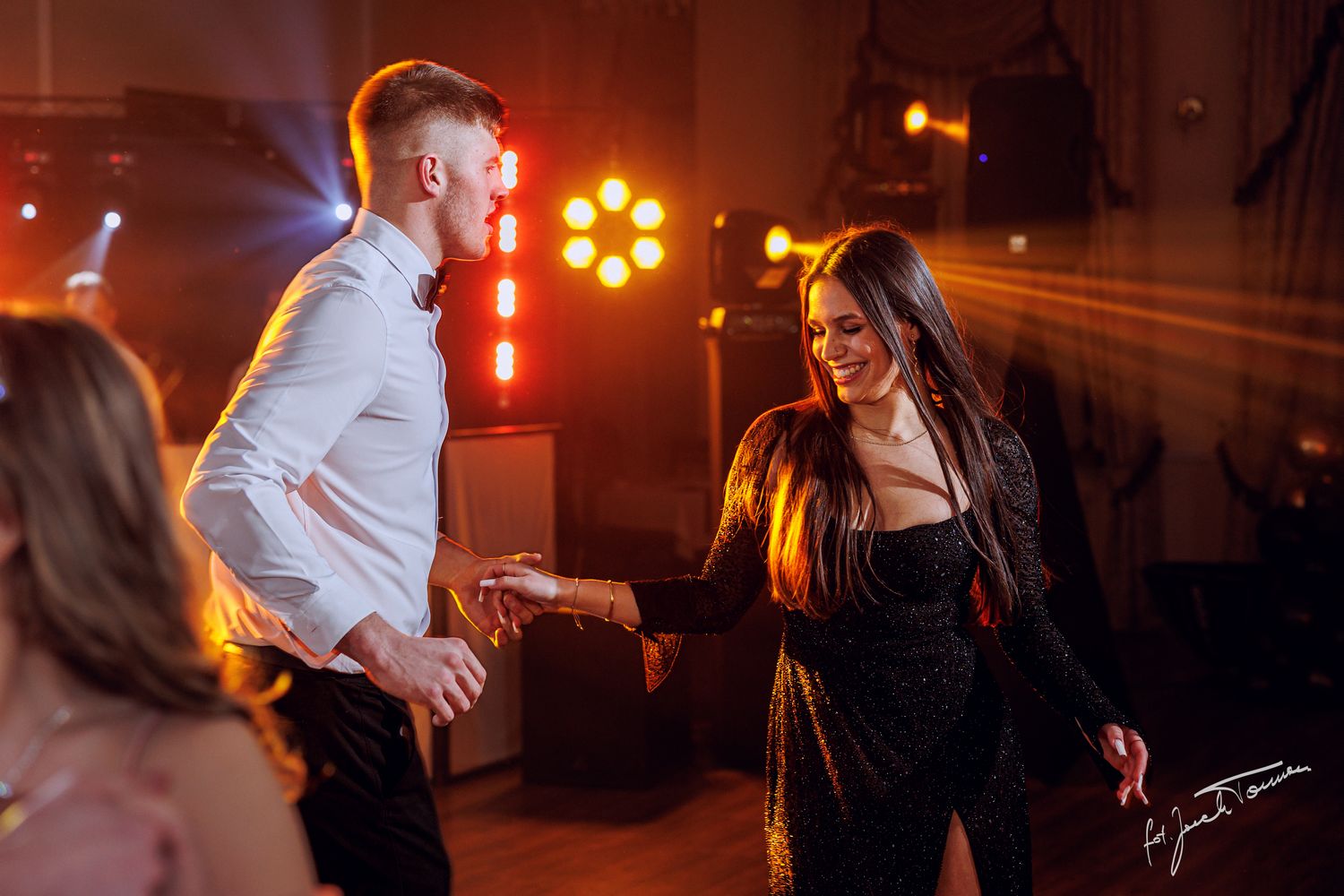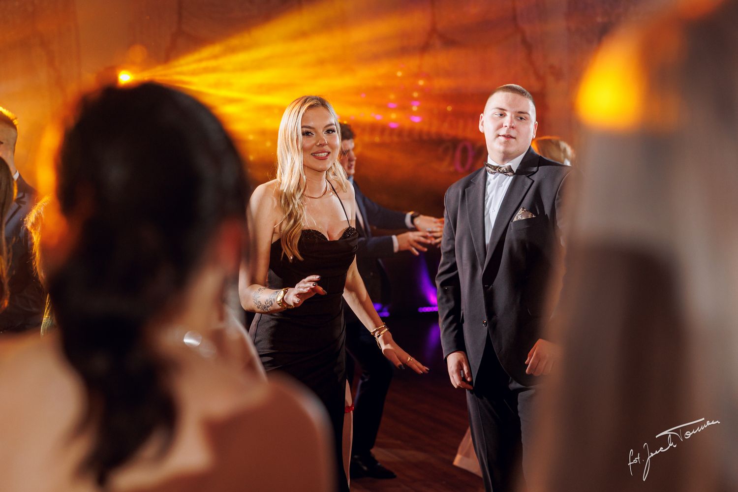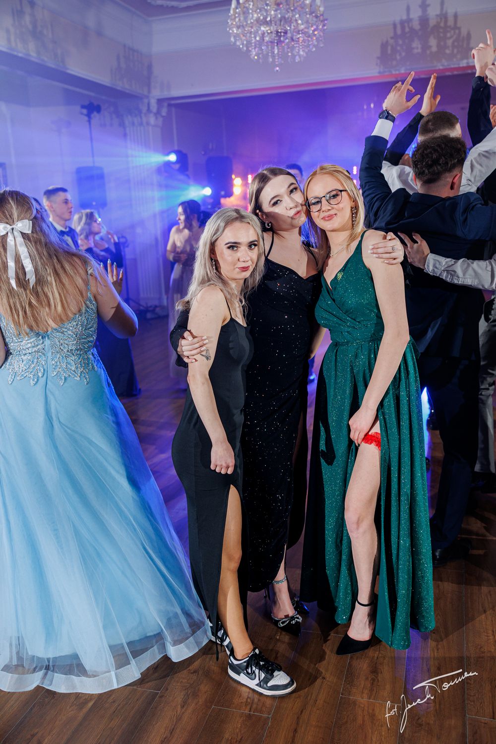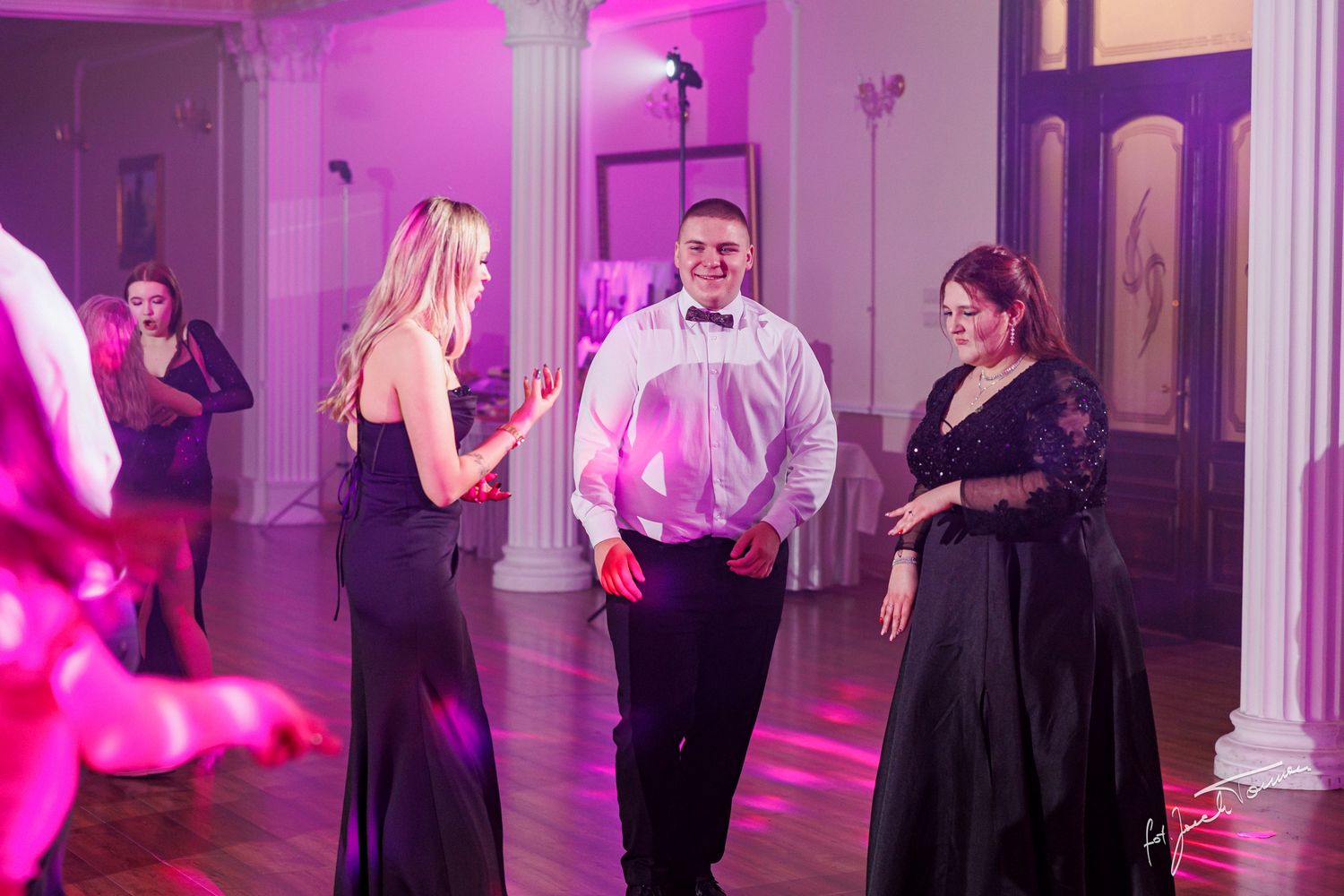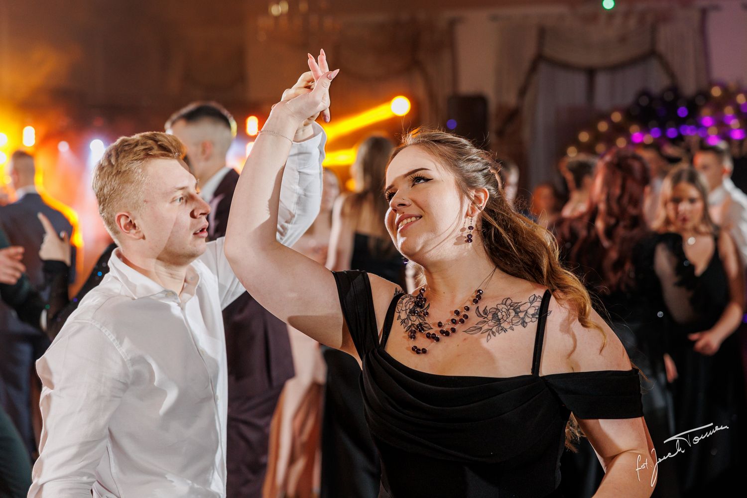 Po oficjalnej części przyszedł czas na tańce i radosną zabawę. Tylko na chwilę przerwali je wychowawcy – Ewa Makowska i Bartłomiej Wojciechowski – by wręczyć swoim uczniom czterolistne koniczynki na szczęście. Ten miły gest wywołał uśmiechy na twarzach maturzystów.