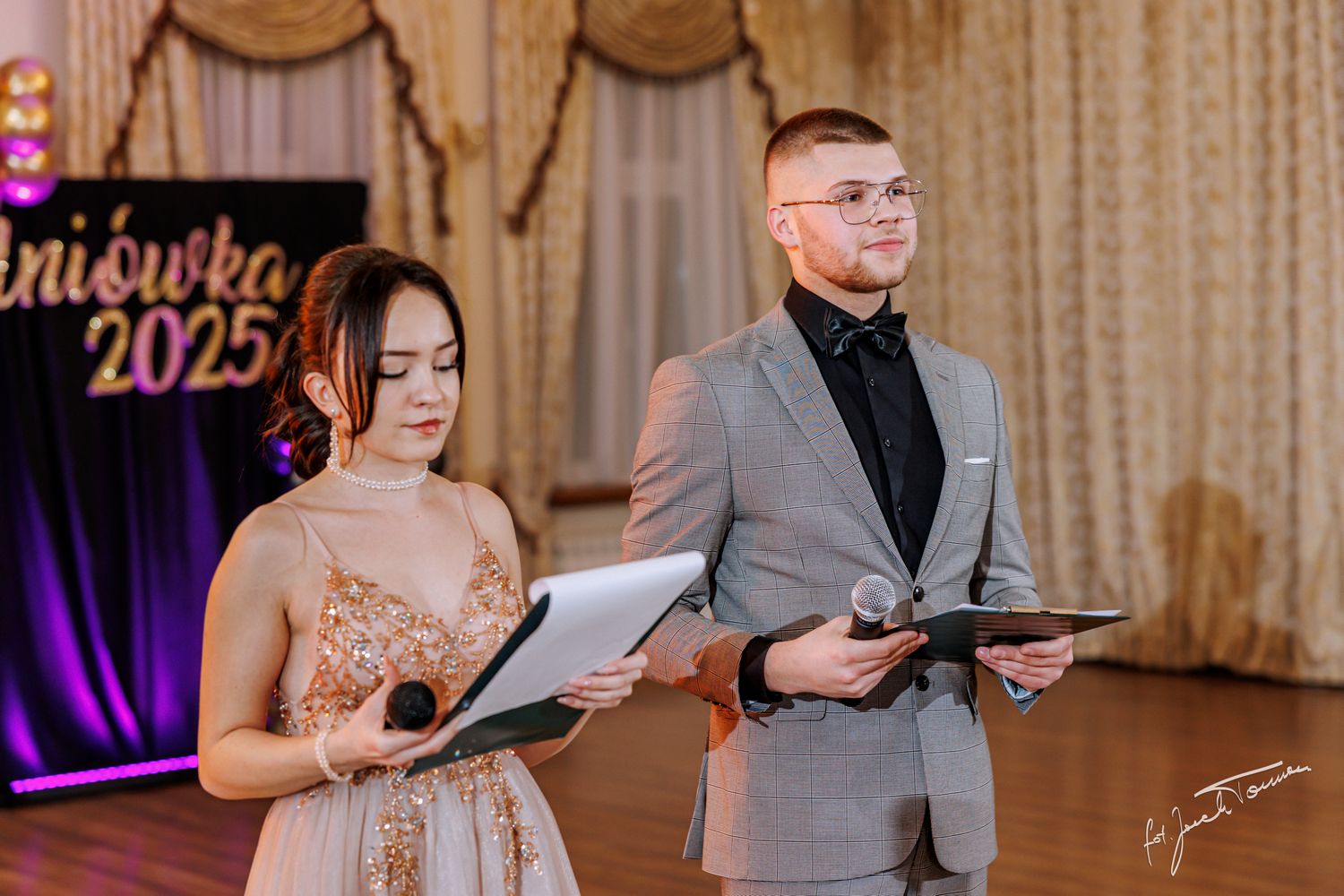 Wieczór rozpoczął się od tradycyjnego poloneza, który wprowadził wszystkich w podniosły nastrój. Następnie Marcelina Tadych i Hubert Kowalski, w imieniu swoich koleżanek i kolegów, serdecznie powitali wszystkich obecnych. Nie zabrakło również wzruszających podziękowań i pięknych kwiatów dla dyrekcji szkoły, nauczycieli i rodziców za ich nieustanne wsparcie, zrozumienie i motywowanie do coraz efektywniejszej nauki.