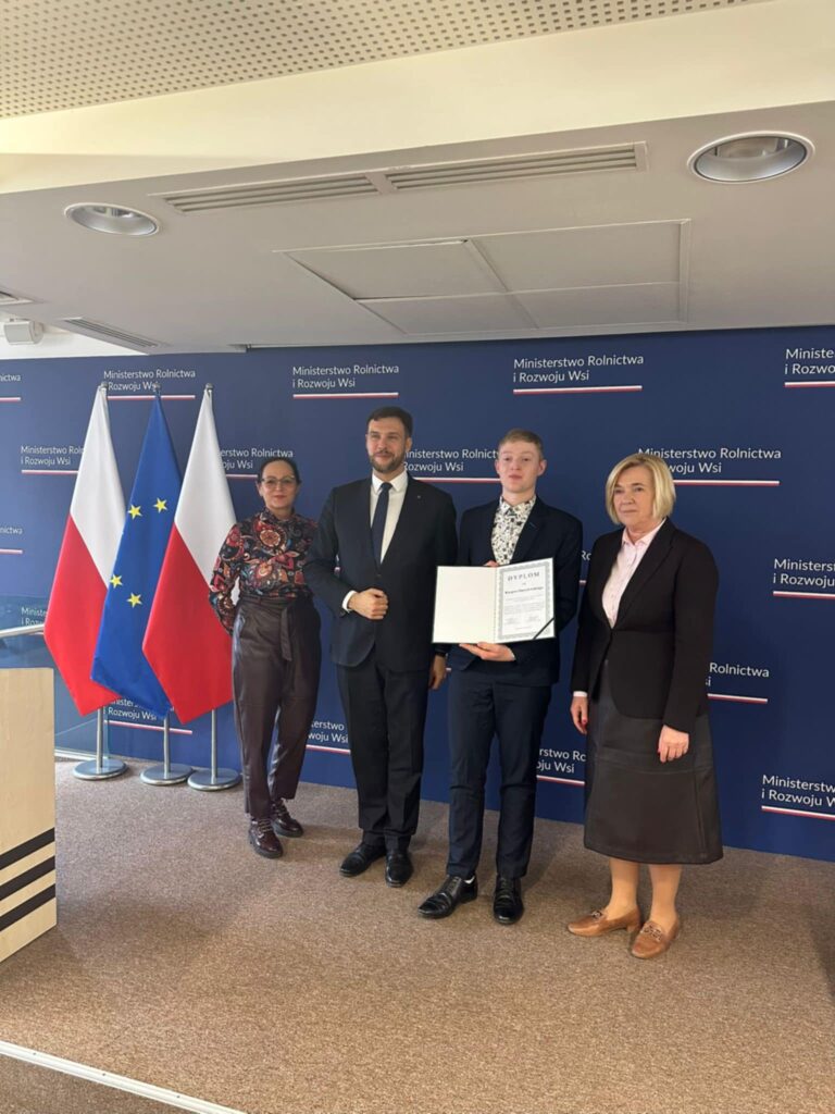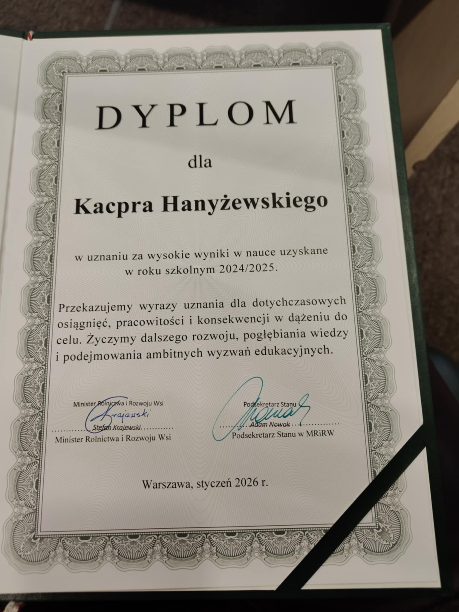 12 stycznia br. w gmachu Ministerstwa Rolnictwa i Rozwoju Wsi odbyła się wyjątkowa uroczystość, podczas której wiceminister Adam Nowak wręczył nagrody najlepszym uczniom szkół rolniczych wchodzących w skład Sieci Szkół Rolniczych MRiRW. Wśród wyróżnionych uczniów znalazł się uczeń III klasy Technikum Weterynarii w Zespole Szkół Centrum Kształcenia Rolniczego im. Wincentego Witosa w Samostrzelu, Kacper Hanyżewski, który na koniec roku szkolnego 2024/2025 otrzymał świadectwo z wyróżnieniem i uzyskał bardzo wysoką średnią ocen w szkole. Kacper, to uczeń, który angażuje się w realizację różnorodnych projektów, reprezentuje szkołę w licznych konkursach, również o zasięgu ogólnopolskim,