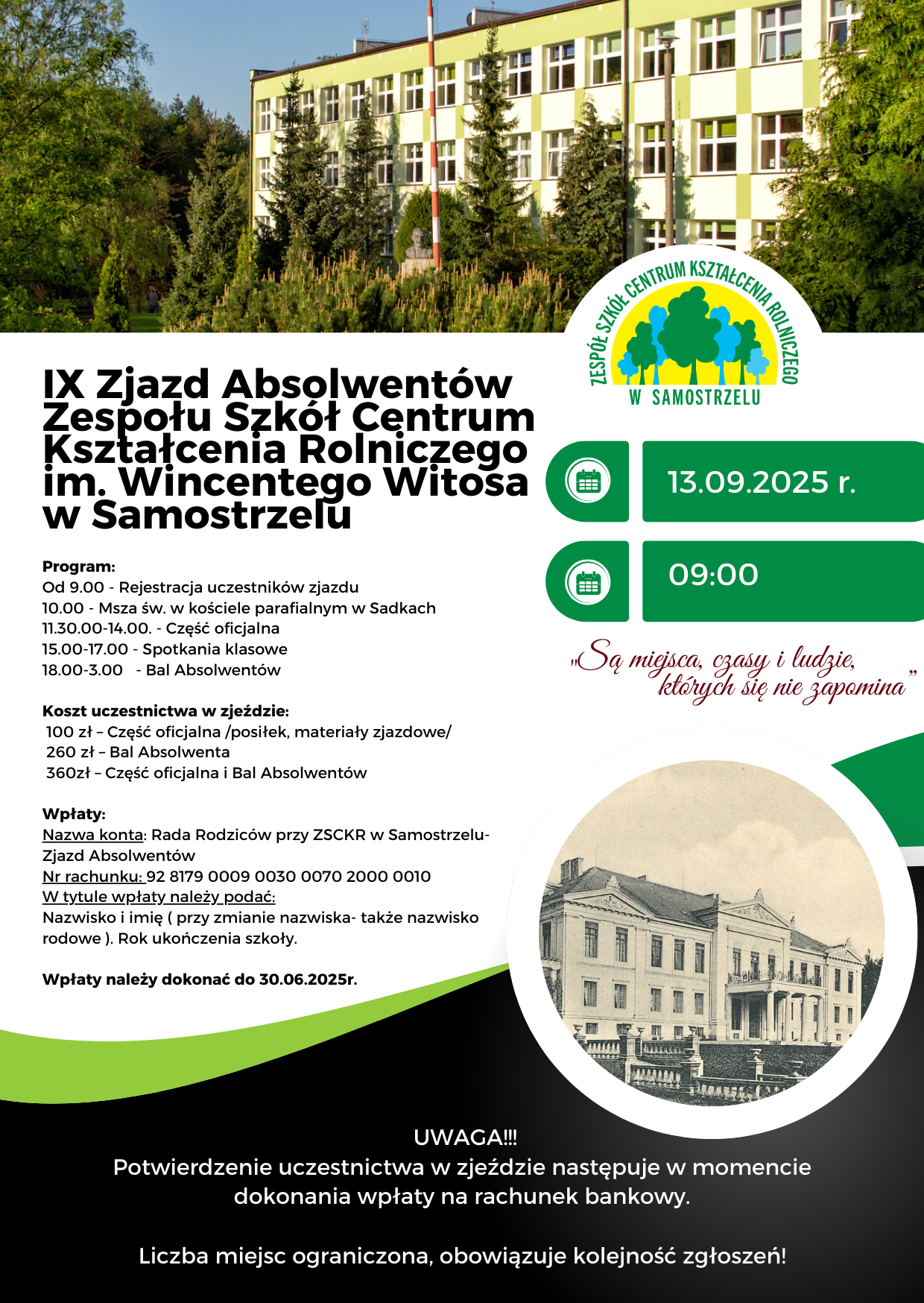 Program:Od 9.00 – Rejestracja uczestników zjazdu10.00 – Msza św. w kościele parafialnym w Sadkach11.30-14.00 – Część oficjalna15.00-17.00 – Spotkania klasowe18.00-03.00 – Bal Absolwentów Koszt uczestnictwa w zjeździe:100 zł – Część oficjalna /posiłek, materiały zjazdowe/260 zł – Bal Absolwenta360 zł – Część oficjalna i Bal Absolwentów Wpłaty: Nazwa konta: Rada Rodziców przy ZSCKR w Samostrzelu- Zjazd… Continue Reading IX Zjazd Absolwentów Zespołu Szkół CentrumKształcenia Rolniczego im. W. Witosa w Samostrzelu,który odbędzie się 13 września 2025 r.