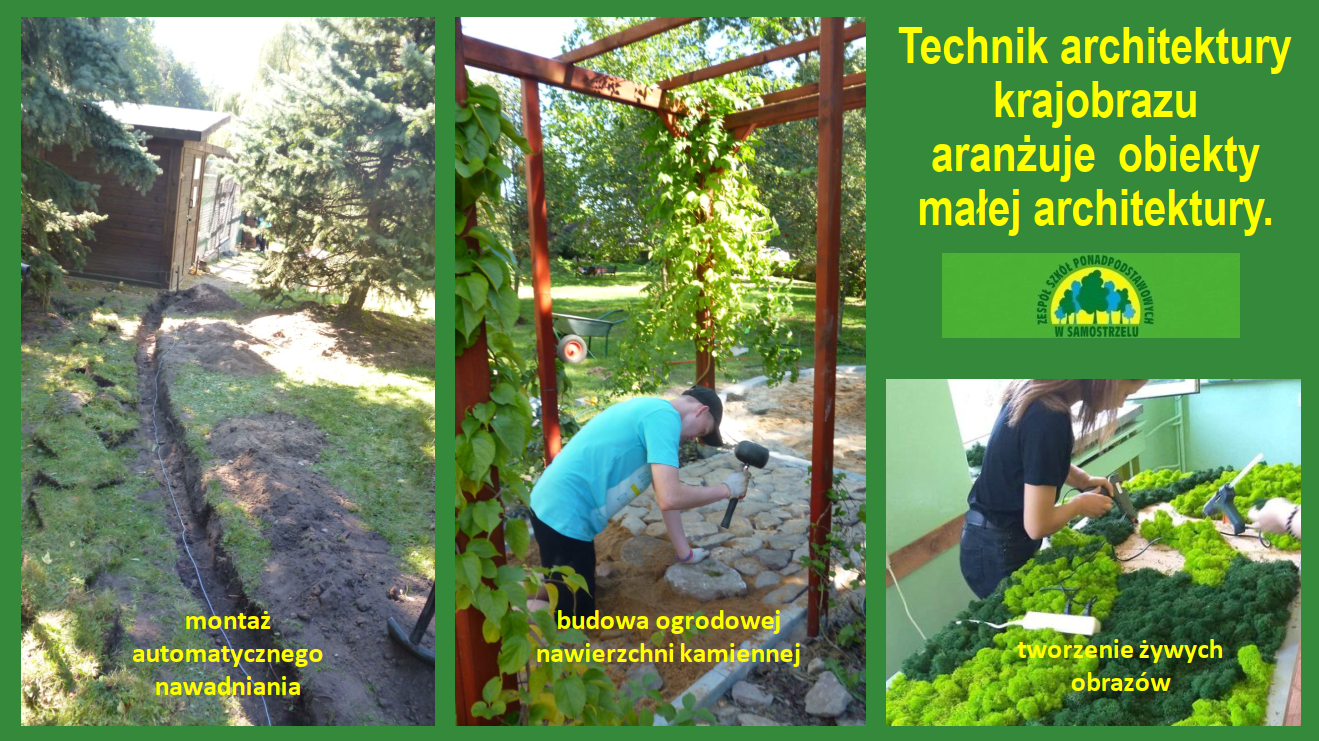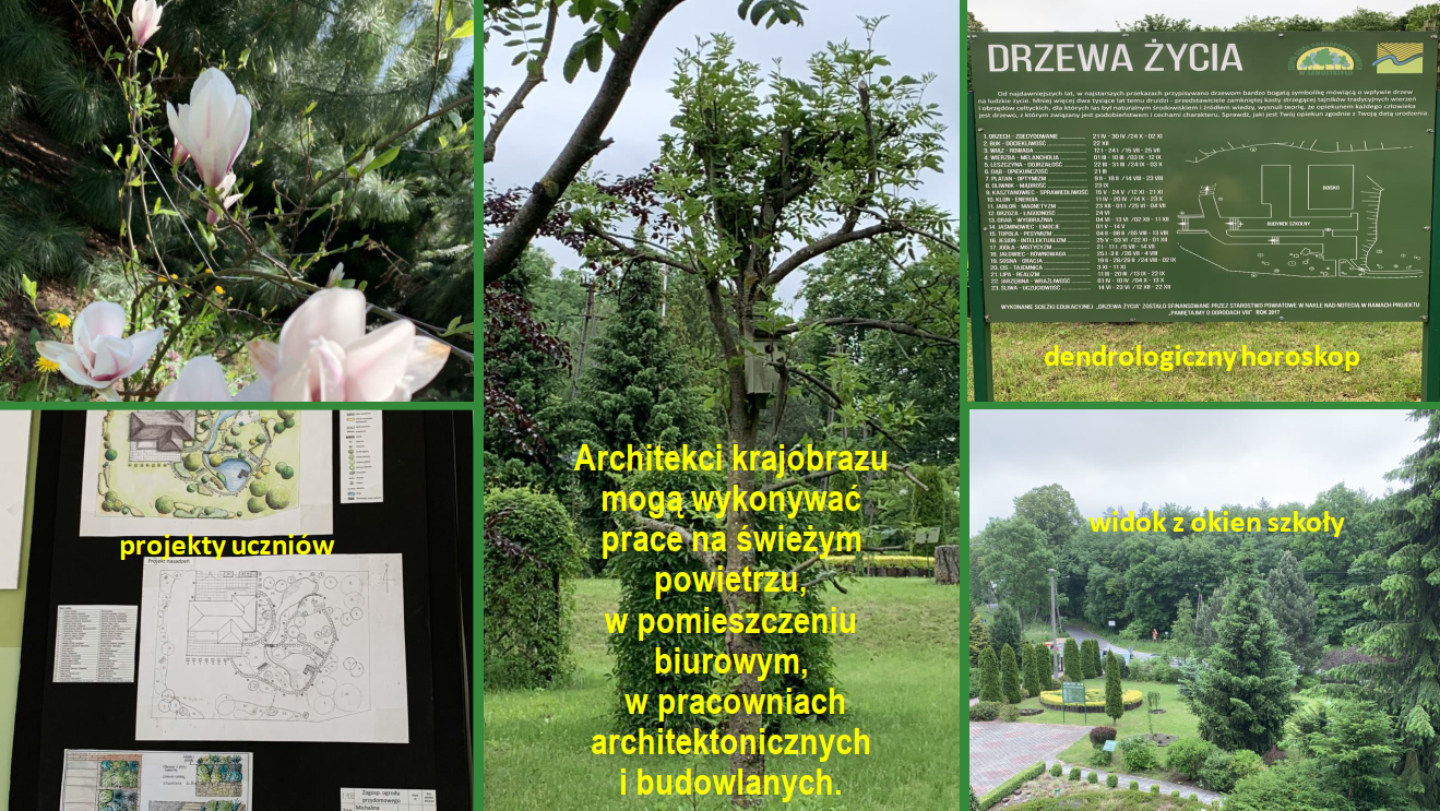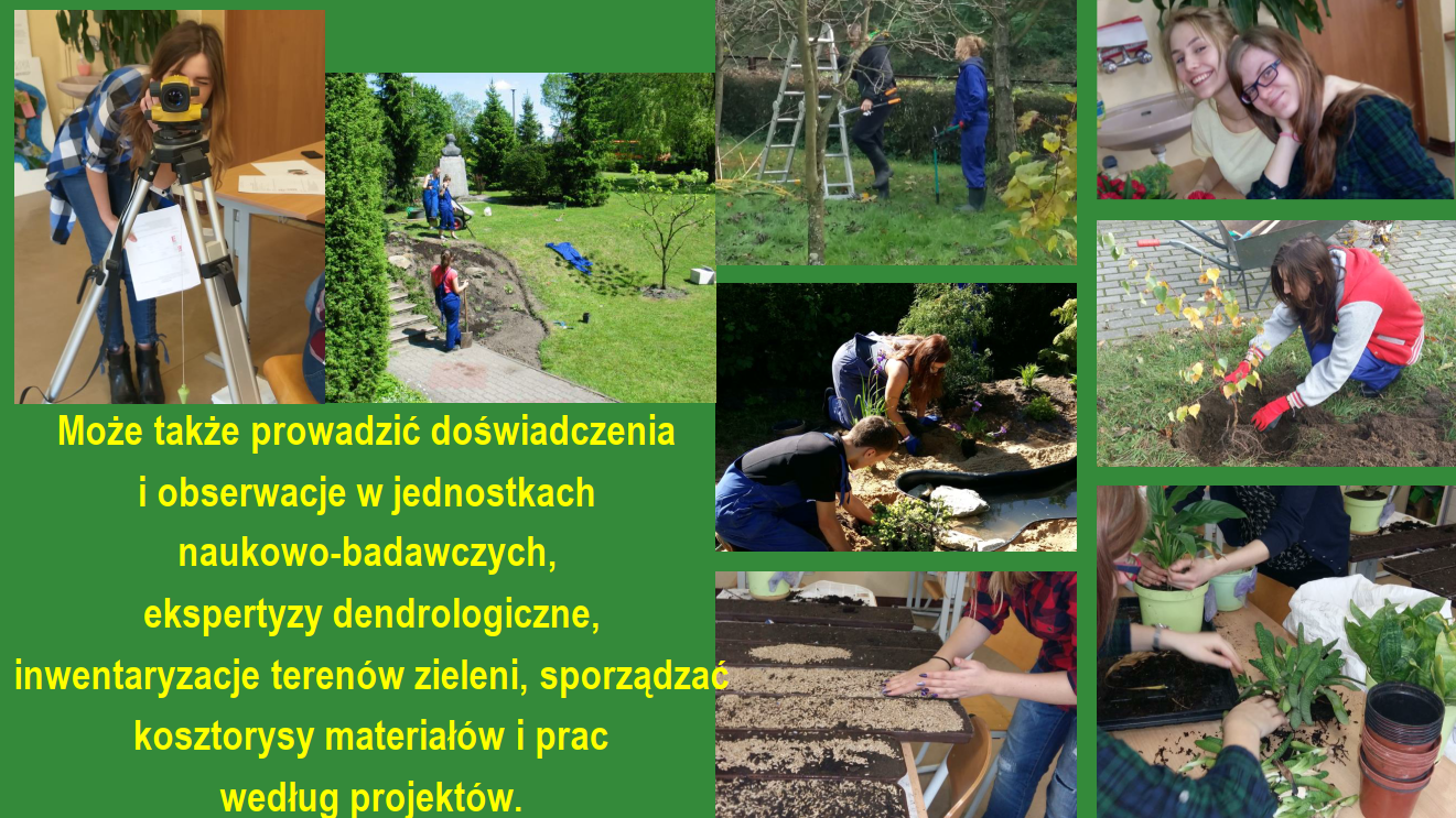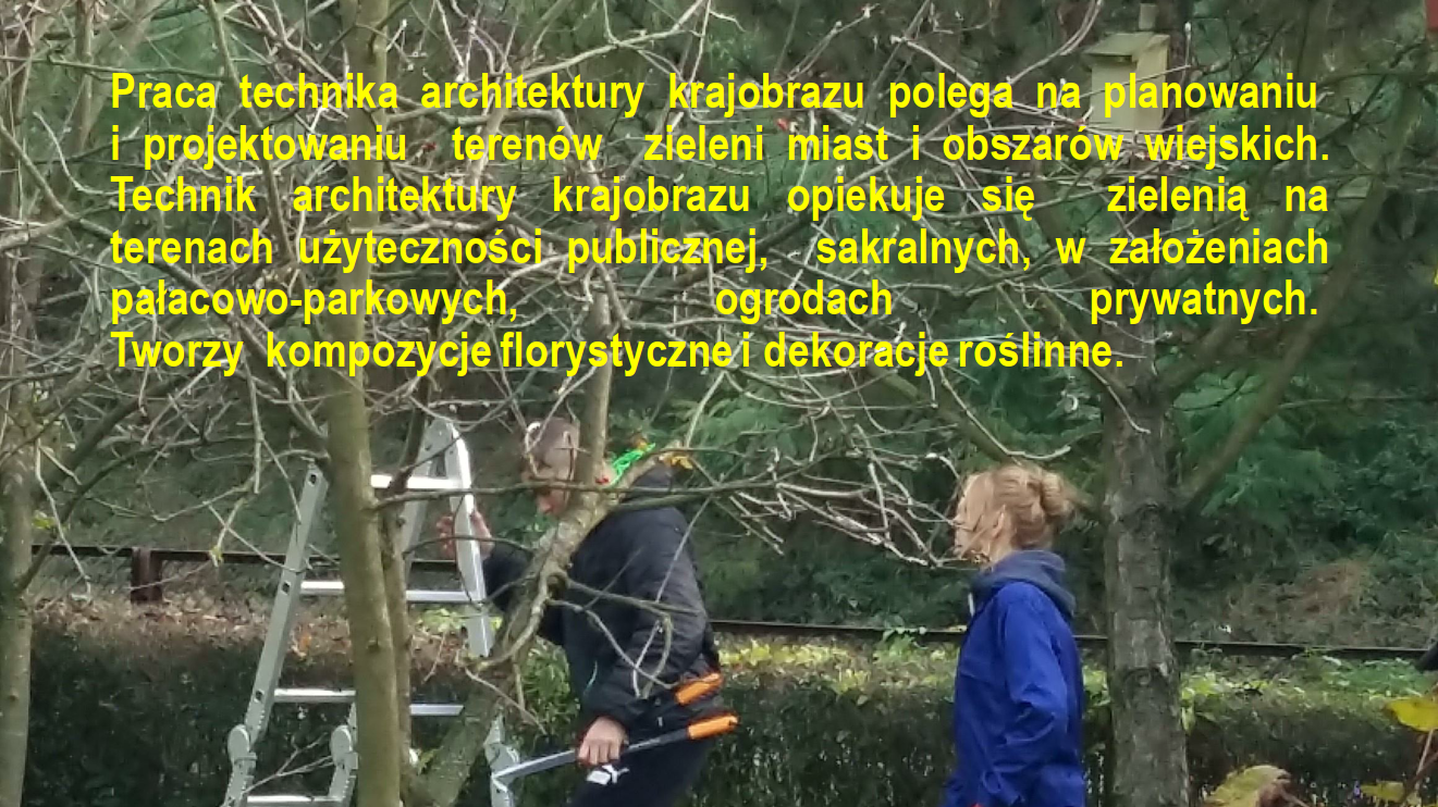 – technik architektury krajobrazu projektuje, urządza, pielęgnuje tereny zieleni miast i obszarów wiejskich. Może pracować w biurach projektowania obiektów architektury krajobrazu, przedsiębiorstwach wykonywania i pielęgnacji obiektów architektury, jednostkach administracji samorządowych (m.in. w wydziałach geodezji kartografii, ochrony środowiska, kształtowania i pielęgnacji terenów zieleni w placówkach służb ochrony zabytków i przyrody.