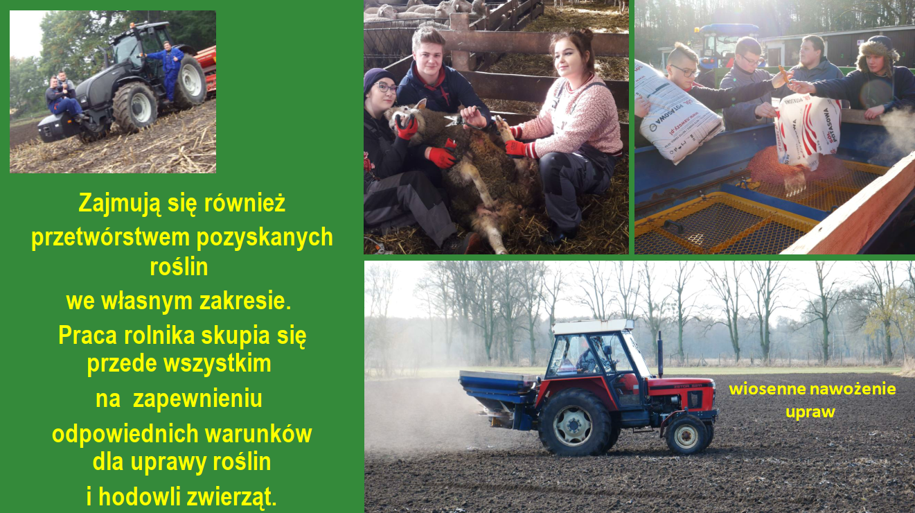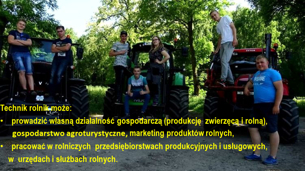 – technik rolnik organizuje i nadzoruje prace związane z uprawą roślin oraz chowem, pielęgnowaniem i żywieniem zwierząt gospodarskich. Może prowadzić własną działalność gospodarczą, gospodarstwa agroturystyczne, marketing produkcji rolniczej. Może pracować w rolniczych przedsiębiorstwach produkcyjnych.