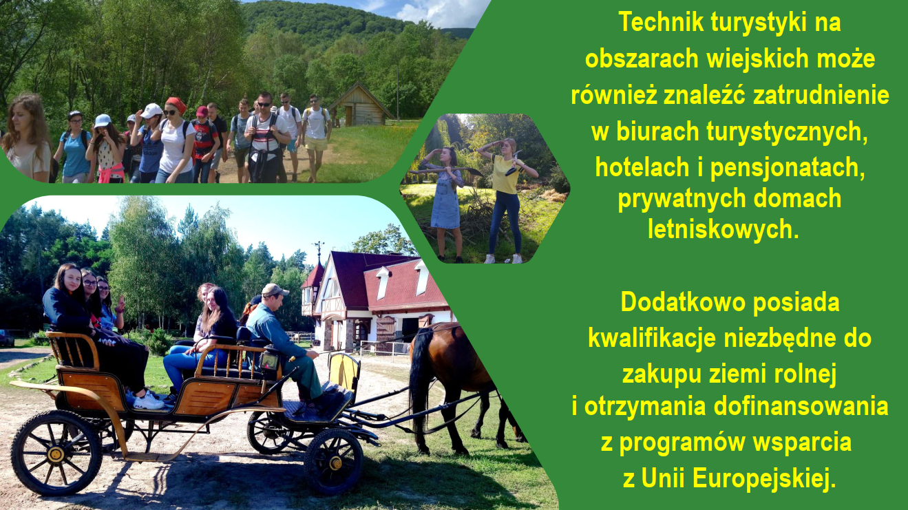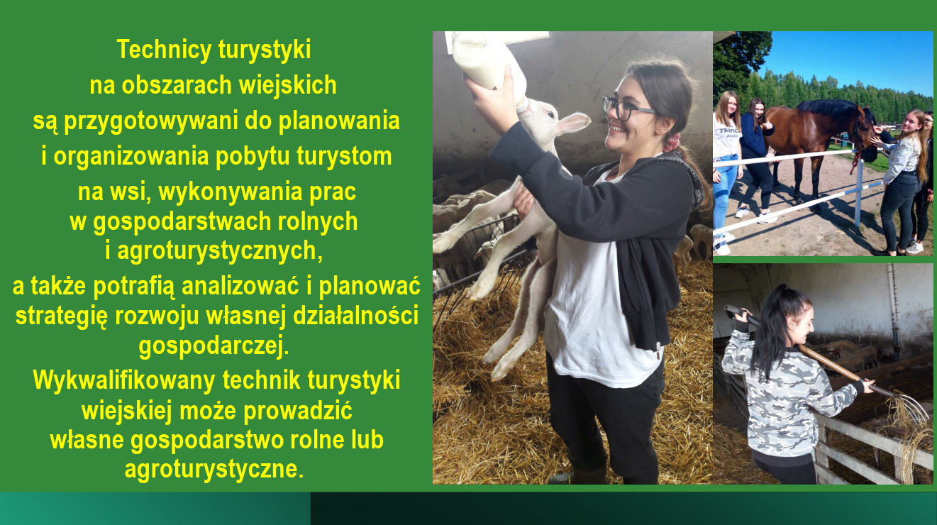 – technik turystyki na obszarach wiejskich jest przygotowany do planowania i organizacji pobytu turystów na wsi, wykonywania prac w gospodarstwach rolnych i agroturystycznych, potrafi także planować i analizować strategię rozwoju własnej działalności gospodarczej, może prowadzić własne gospodarstwo rolne lub agroturystyczne.