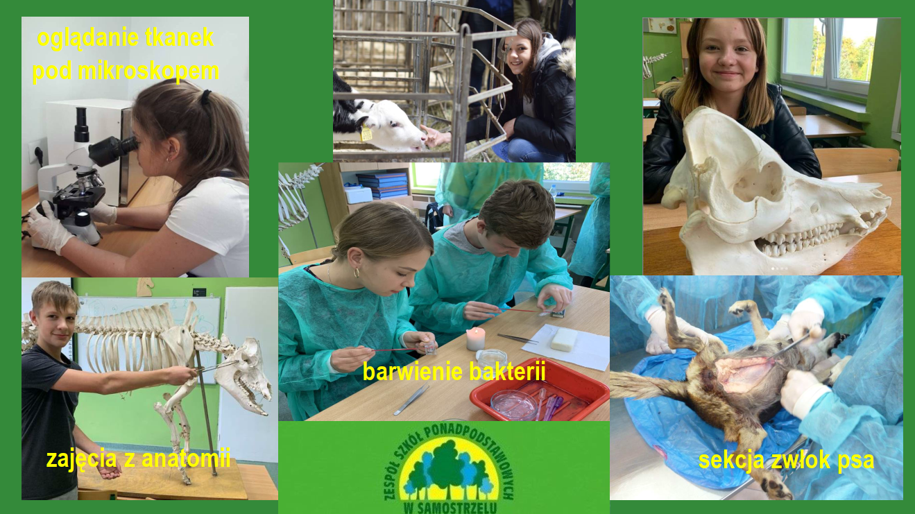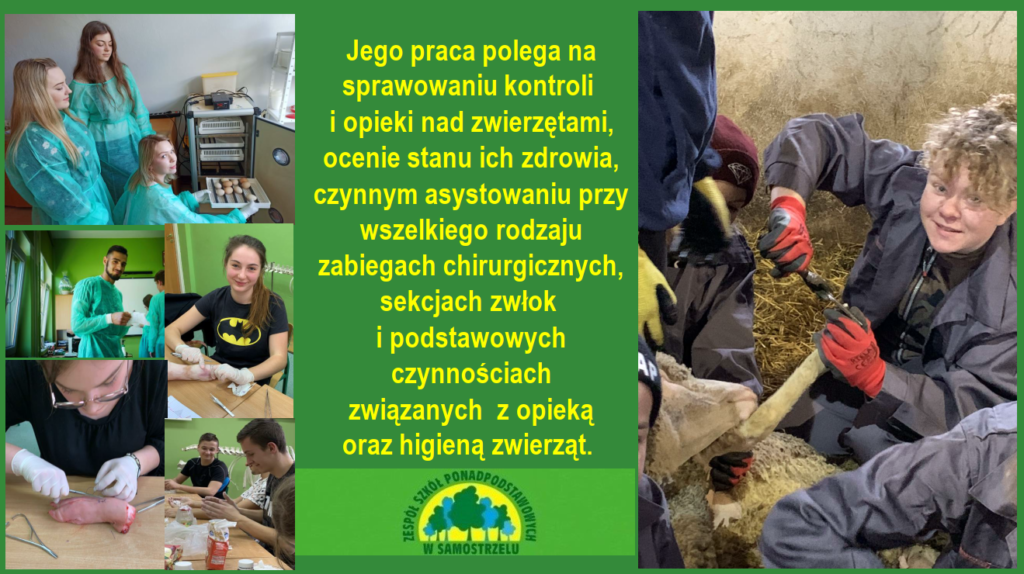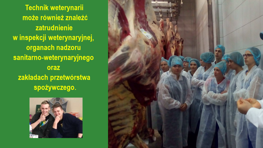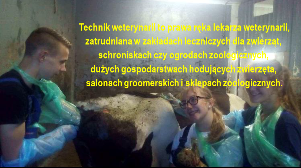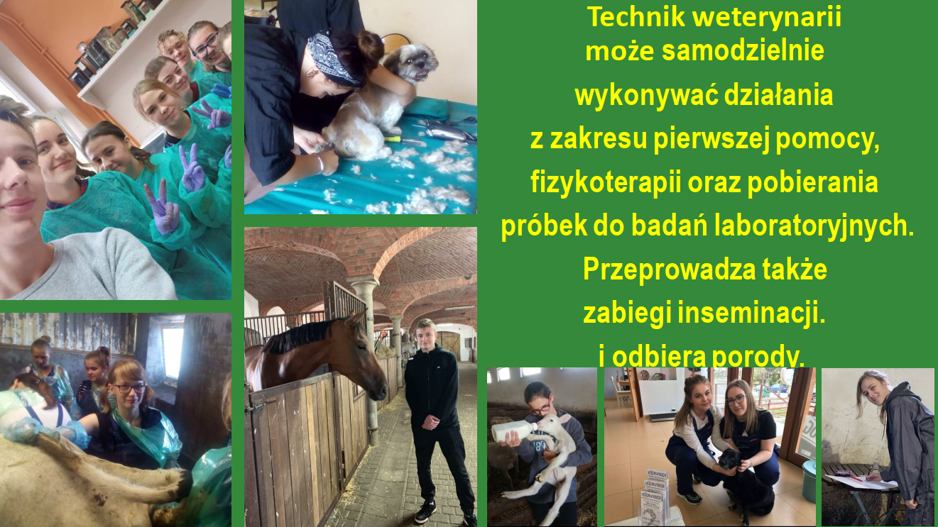 – technik weterynarii przygotowany jest do chowu i hodowli zwierząt, diagnozowania, profilaktyki i leczenia chorób zwierząt, wykonywania zabiegów pielęgnacyjnych i zootechnicznych u zwierząt, prowadzenia badań przed i po ubojowych zwierząt i mięsa. Może pracować w przychodniach i lecznicach, laboratoriach, schroniskach, zakładach hodowli, fermach, stadninach koni, zakładach przetwórstwa spożywczego.